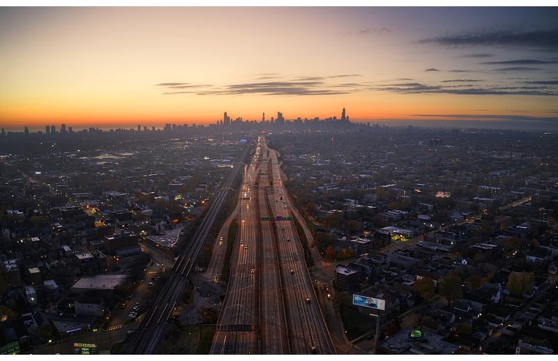 Chicago is known for it's intricate street system which traditionally follows a grid pattern. This is one of the main arteries, the Kennedy expressway, that bypasses those for a quick route to downtown.