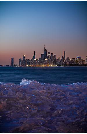 When the waves crash against the ice along the lakefront, it creates a shelf like layer of shards of ice. When the sun hits it just right, it glows with all different colors.