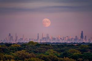 The almost full moon rises above Chicago, as seen from 14 miles away.