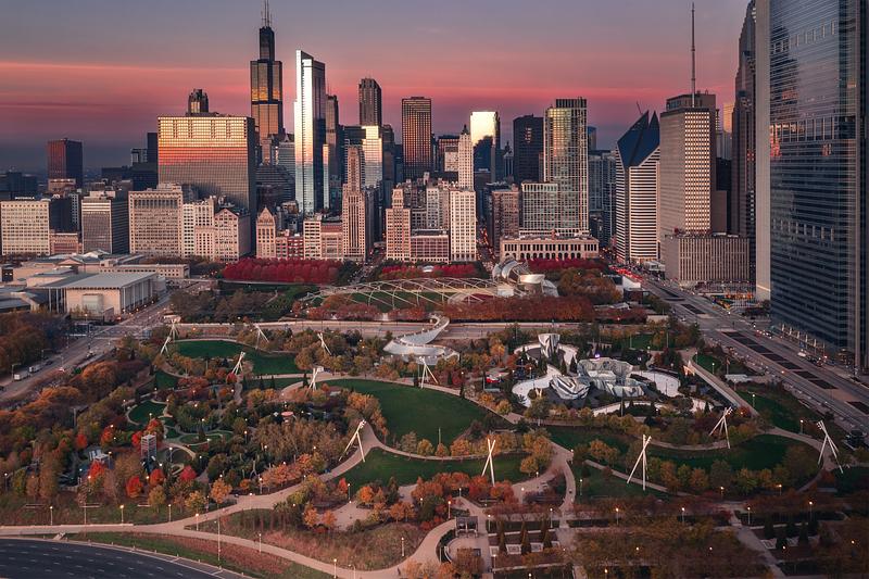 The iconic Millennium Park in Chicago covered with fall colors.