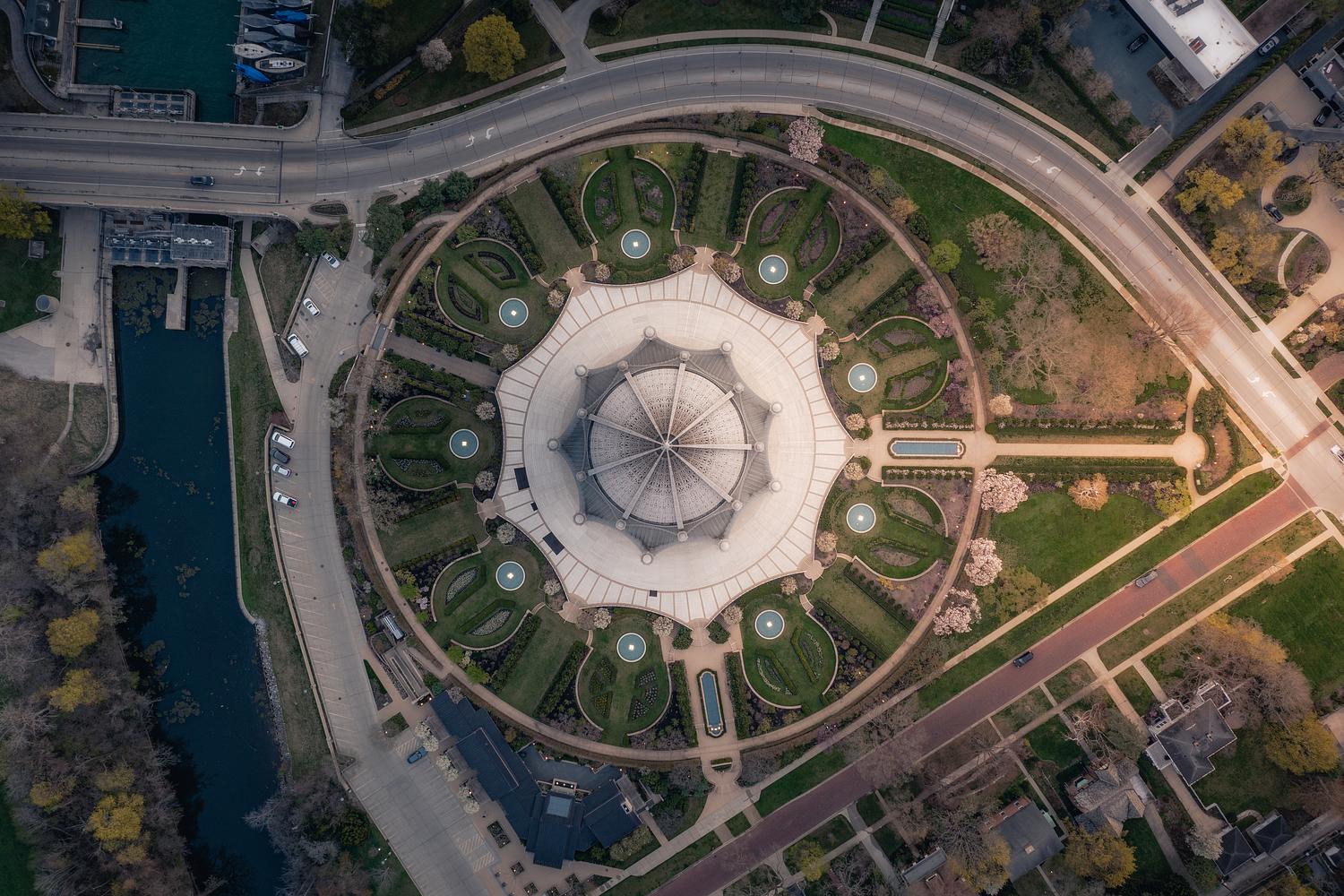 This is a top down angle over the Baha'i House of Worship and it's perfectly manicured grounds in Wilmette.